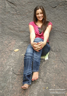 Dazzling beauty from down South, Navneet Kaur in jeans, barefoot, and red top in a photoshoot on the rockface.